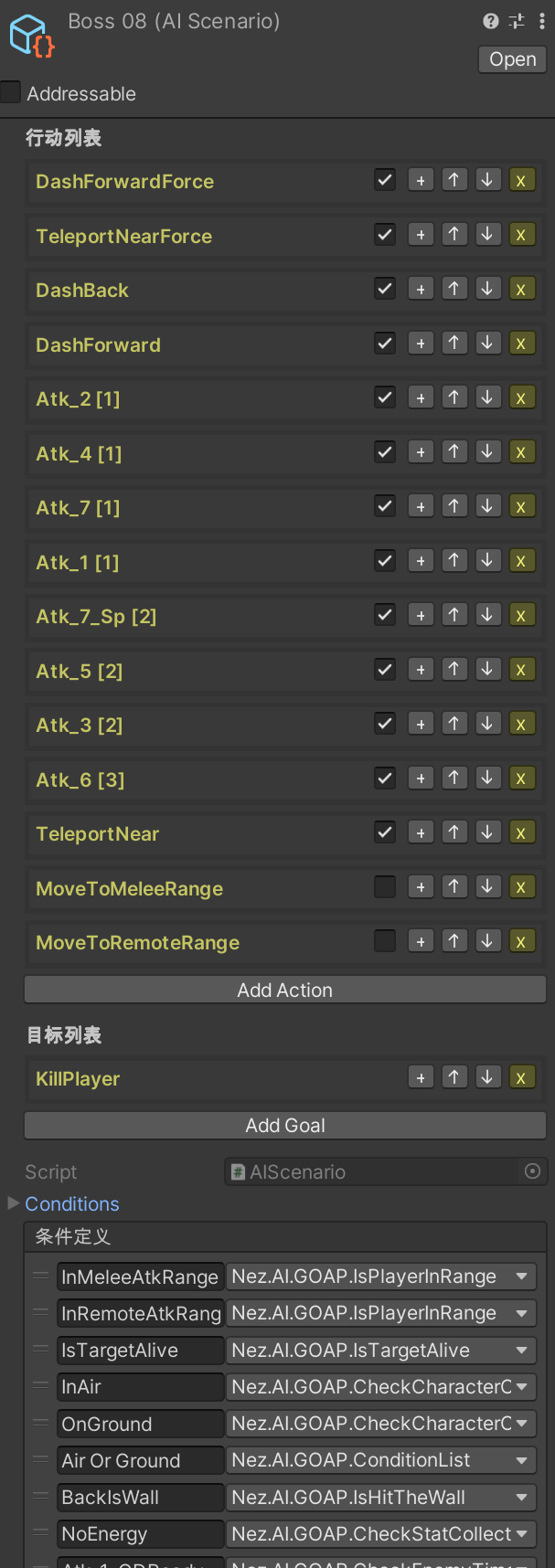 项目后期业余时间探索了GOAP、ActionList用于实现游戏AI的框架 发现GOAP用于制作招式非规律性的怪还是很方便的